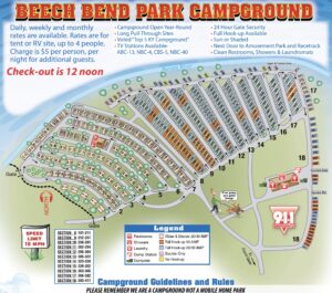Beech Bend has the right to remove any RV, tent, and/or possessions at owners’ expense if the site is not vacated at scheduled time or if a tenant is found disobeying our rules.