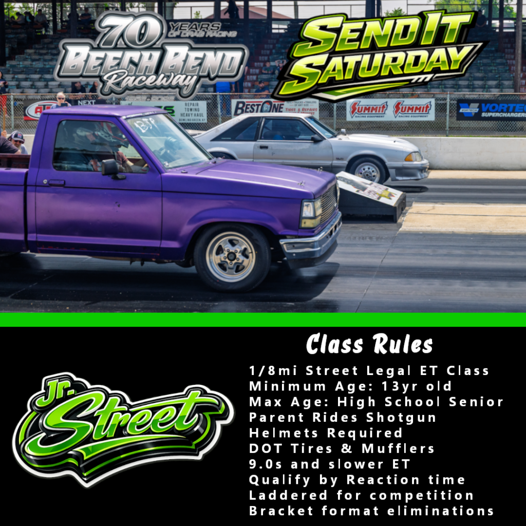 Send IT Saturday’s are action packed at Beech Bend Raceway! Featuring drag race Test & Tune action that is welcome to all levels of racers and cars. Grassroots drift pad is open on select dates. And don’t miss Swap Meets on select Saturday’s! Send It Saturday also features two competition classes on the drag strip with the O’Reillys Saturday Shootout & Felts Towing Jr. Street Championship Points Series! More details below.